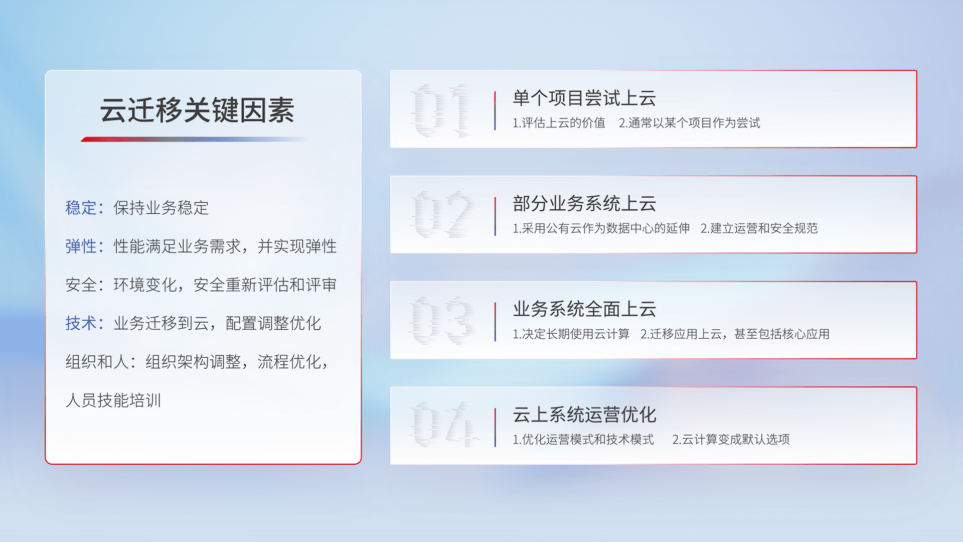 结合实际业务,,从规划设计、、、云平台选型、、、云原生改造、、、、数据迁移、、集成交付,,,迁移全过程为客户识别最佳上云路径,,做好风险识别管理,,设计网络架构、、、身份权限、、安全审计合规、、、、操作审计、、日志审计、、监控告警策略、、多站点容灾设计等,,对云上基础设施进行整体规划,,,,提升IT治理水平,,,以满足弹性、、、、高可用、、、、高性能的需求。。