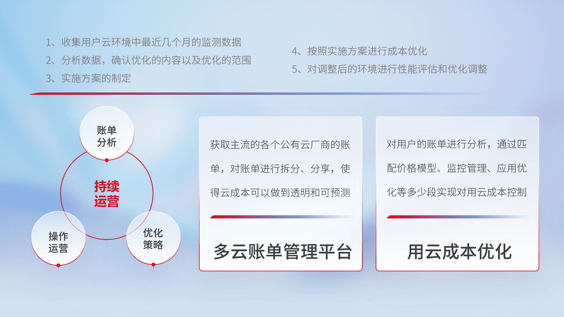 通过多云纳管,,,以统一的资源数据模型把客户的云资源进行抽象和封装,,,进而实现对多云资源的统一操作,,,保障云资源管理的可靠性、、、、稳定性与可用性。。。量身定制化运维内容,,,配置、、、开发运维、、、、补丁管理、、、备份、、、监控、、认证和访问管理、、、、审计和日常巡检等,,保障在用云过程中的可靠度,,,,稳定度以及高可用率。。